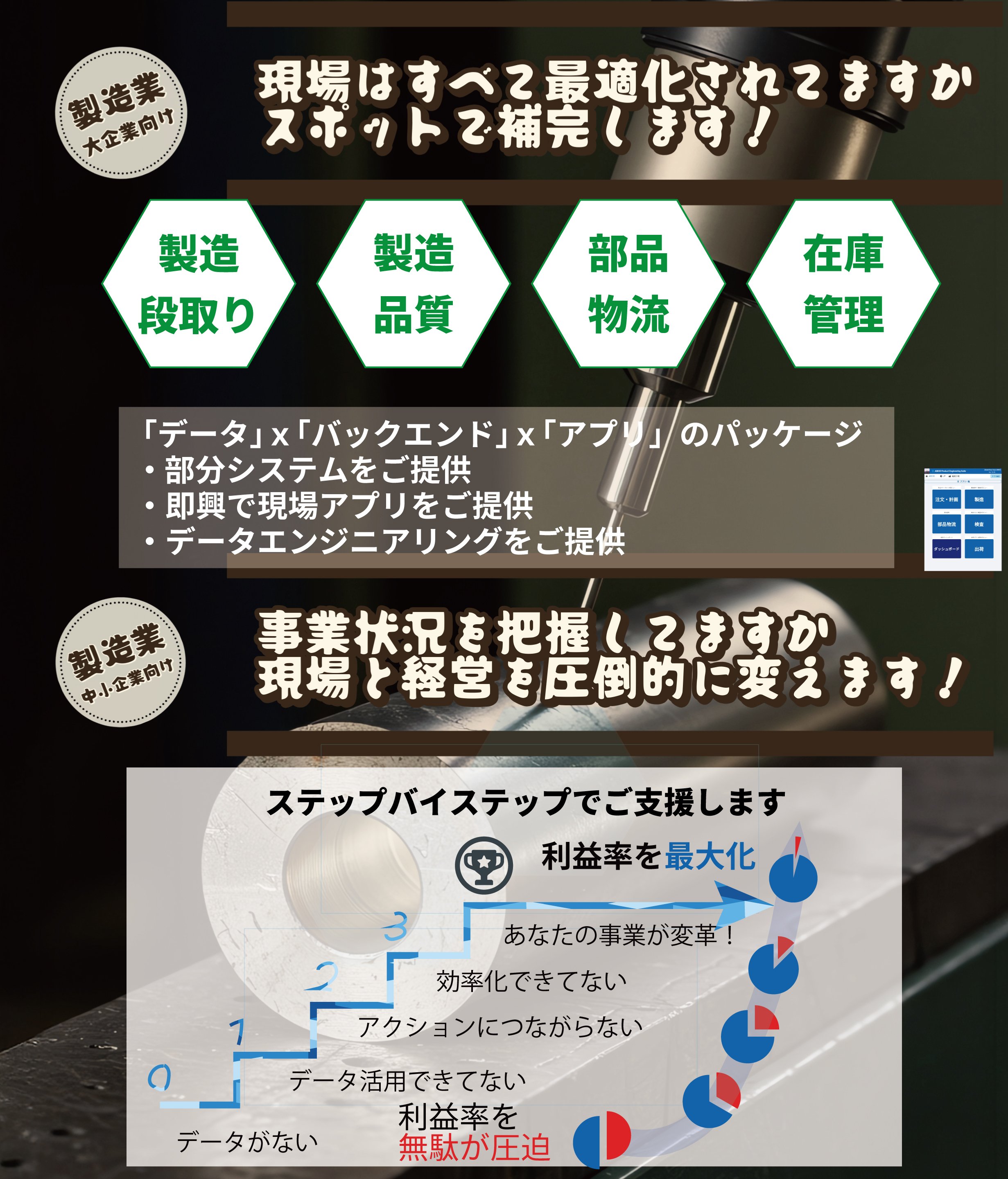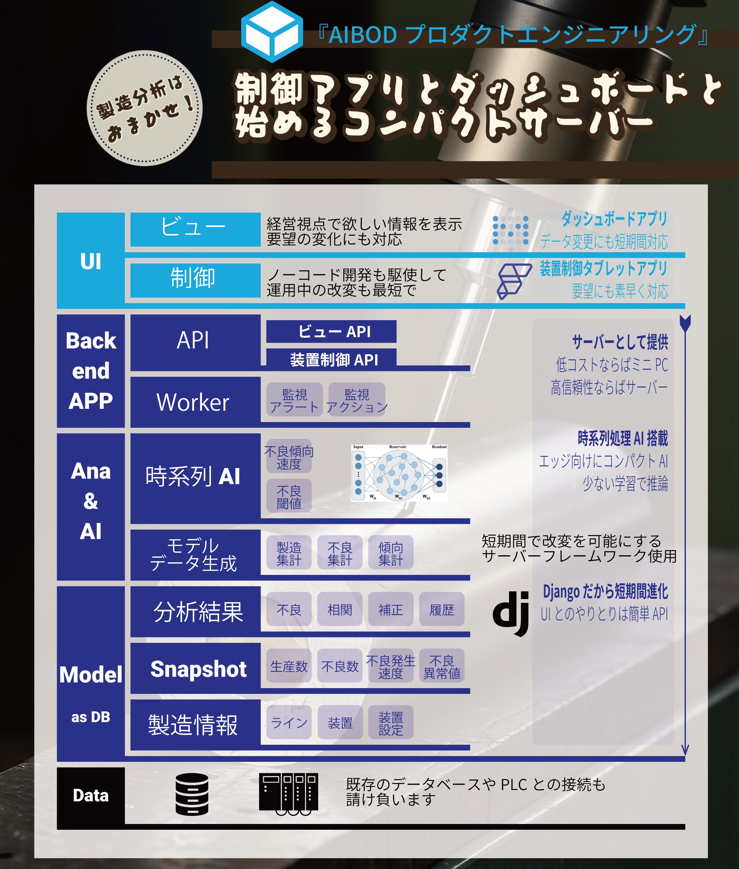| ■強み、セールスポイント 生成AIの普及と進化により、ITによる製造業のデジタル変革には大きなチャンスです。 2016年創業以来蓄積してきたAI設計と現場システム開発の知見により、現場課題からのシステム設計力と実装力が、当社の強みです。 生成AIを取り込んでその強みに磨きをかけています。 変化の速い業界において、まずは即使える現場の小さいシステムを提供、現場とともに進化させる『リーンインテグレーション』を推進・体現しています。 ○クラウドでの製造計画自動生成 ○現場サーバーでの製造・検査データ処理 ○製造を俯瞰した品質システム ○現場での制御・可視化タブレットアプリ ○経営観点のダッシュボード などを迅速に提供し、成長させます。 ■製品イメージ AIC Manufacturingは、製造全体を薄くカバーします。受注データから生産数量計画、製造スケジュール、部品供給スケジュール、在庫までカバーします。 もちろん各機能の個別実装も可能です。 AIC Engineeringは、製造データ、検査データを監視し、異常をアラート、経営視点のインタラクティブ可視化を提供します。 |