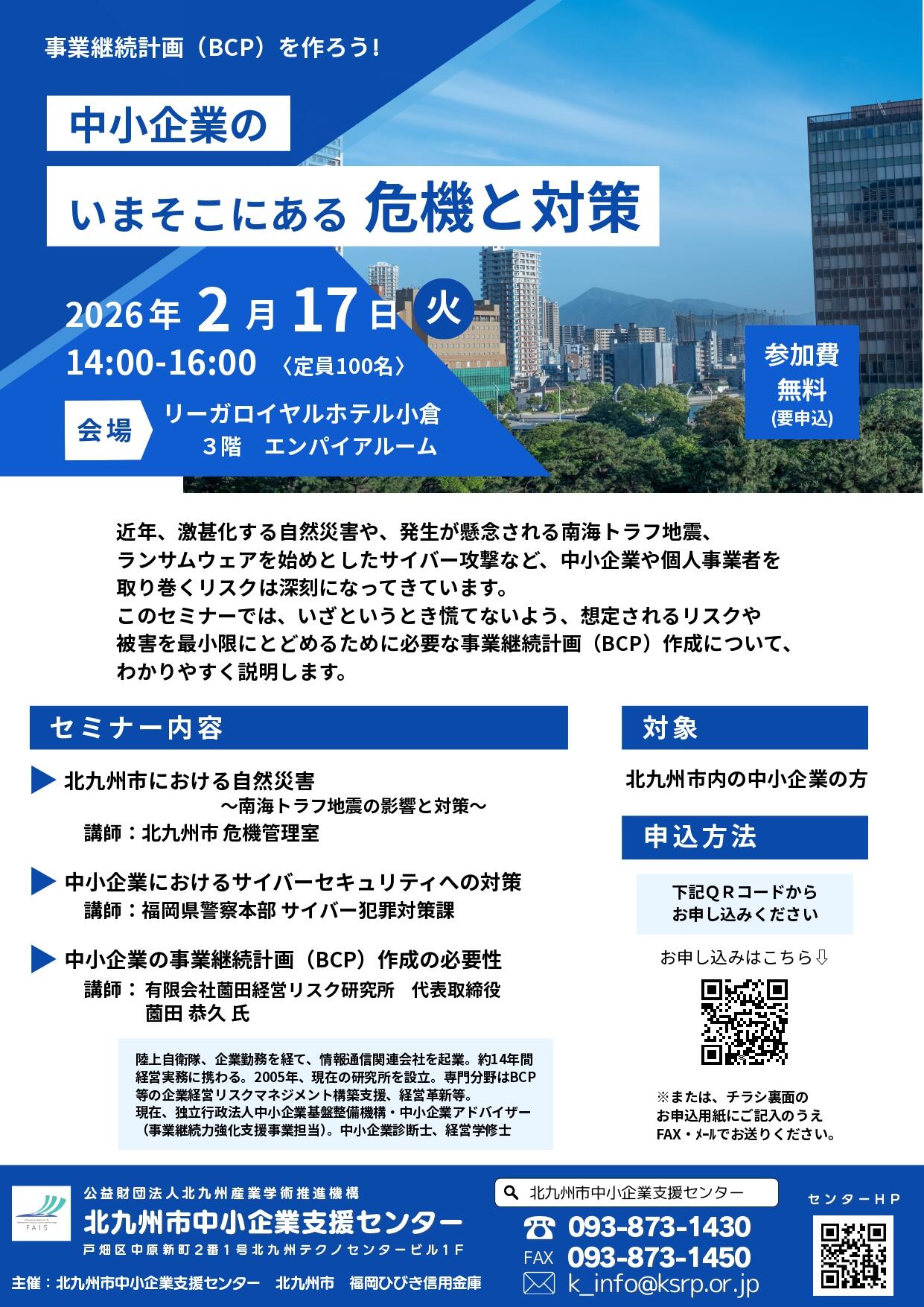 【北九州市中小企業支援センター】2/17(火)中小企業の事業継続計画(BCP)セミナー参加のご案内